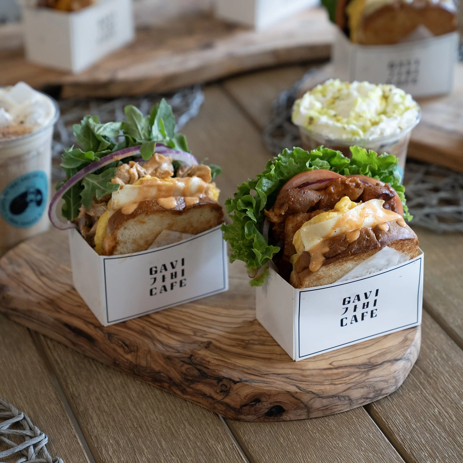 Toasted brioche with lettuce, cabbage, marinated cucumber, scrambled eggs with mozzarella cheese, and marinated fried pork in a special sauce.